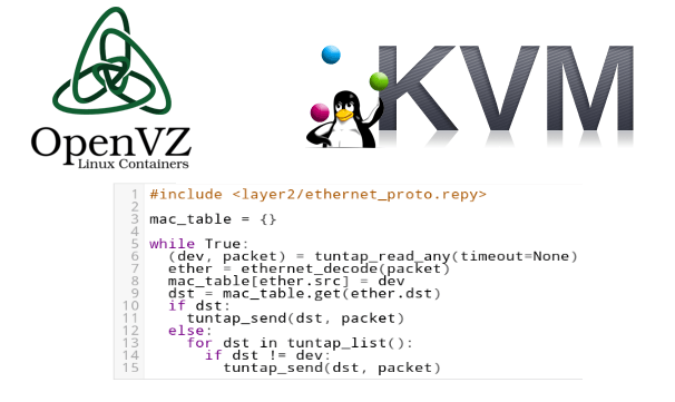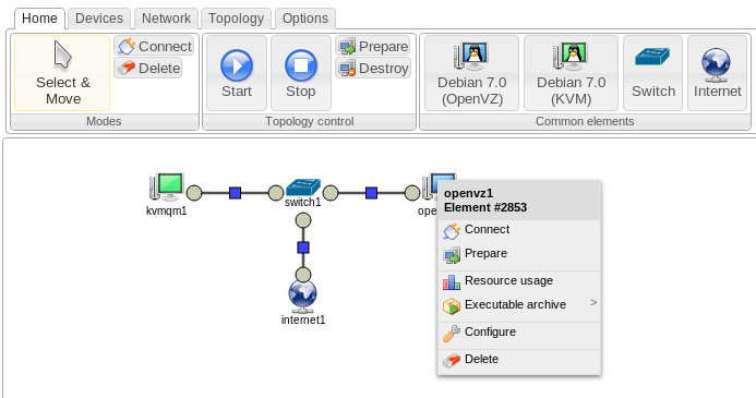 Select from full virtualization (KVM) and container virtualization (OpenVZ) for each topology component to save resources.