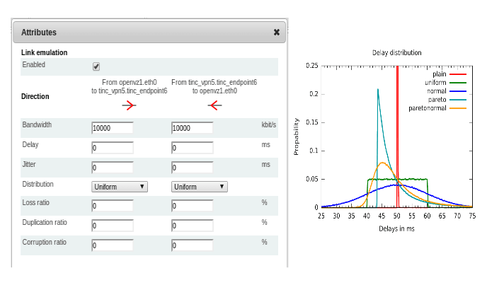 Configure different properties like latency, packet loss or bandwidth on each link.